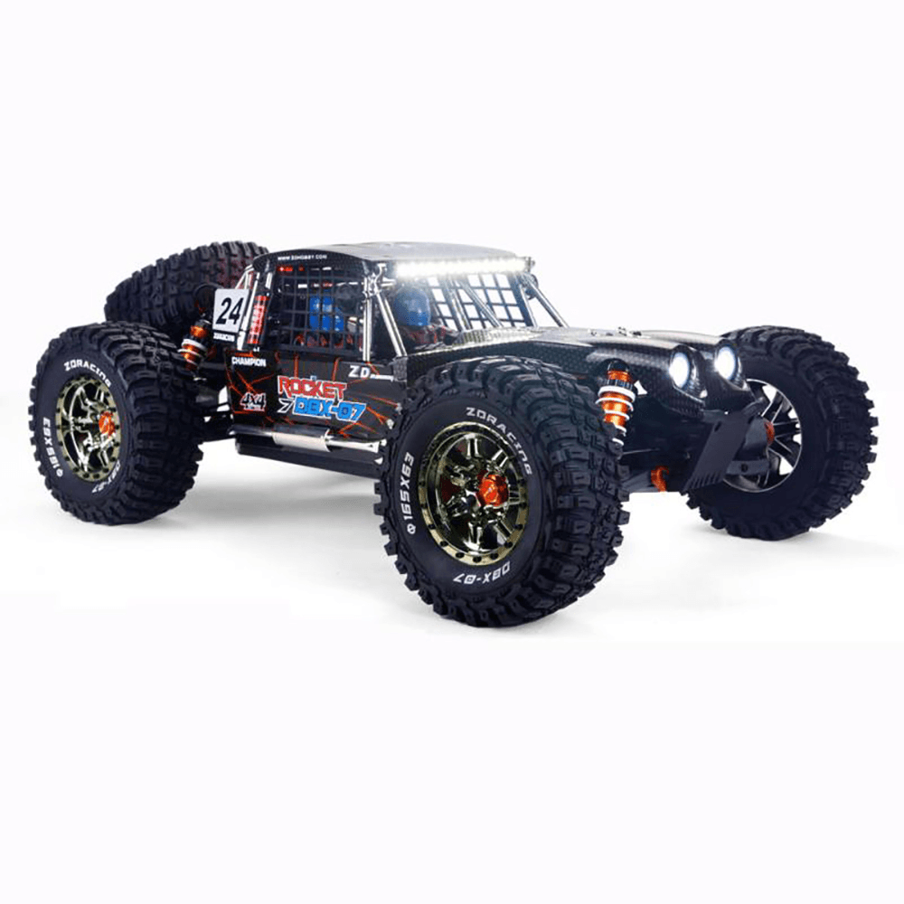 ZD Racing DBX-07 er alvöru 1:7 desert buggy öflugur brushless mótor, stærðarinnar Li-Po rafhlöður og full-metal drifrás gera hann tilbúinn fyrir sand, grjót, mót og ójafnt landslag. Með 2000KV brushless mótor, með 6S rafhlöðustuðningi , 150A ESC, tvöföldum 3S rafhlöðum. Hann nær allt að 80 km/klst og kemur með LED ljósum og olíudempun sem tryggir stöðugan og kraftmikinn akstur. Fullkominn fyrir þá sem vilja stóran, hraðann og ofursterkan RC bíl. Ready-to-Run beint úr kassanum!