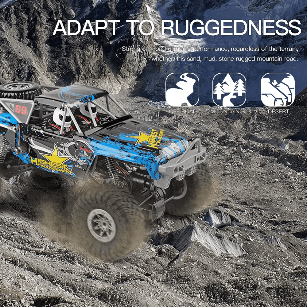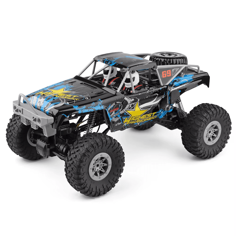 WLtoys 104310 er traustur og skemmtilegur 1:10 4WD torfærubíll með góðu gripi, hárri fjöðrun og einfaldri stjórn. Hann keyrir vel á steinum, mold og grasi og hentar bæði byrjendum og áhugamönnumog hann er byggður fyrir þá sem vilja einfaldan, áreiðanlegan og skemmtilegan RC-bíl, Með endurhlaðanlegri 7.4V rafhlöðu og RTR-uppsetningu er allt tilbúið strax úr kassanum — hlaða, kveikja og keyra!